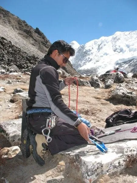 Vår guide Saran går igenom alla klätterselar och ser så att all utrustning är i toppskick inför bestigningen av Island Peak.