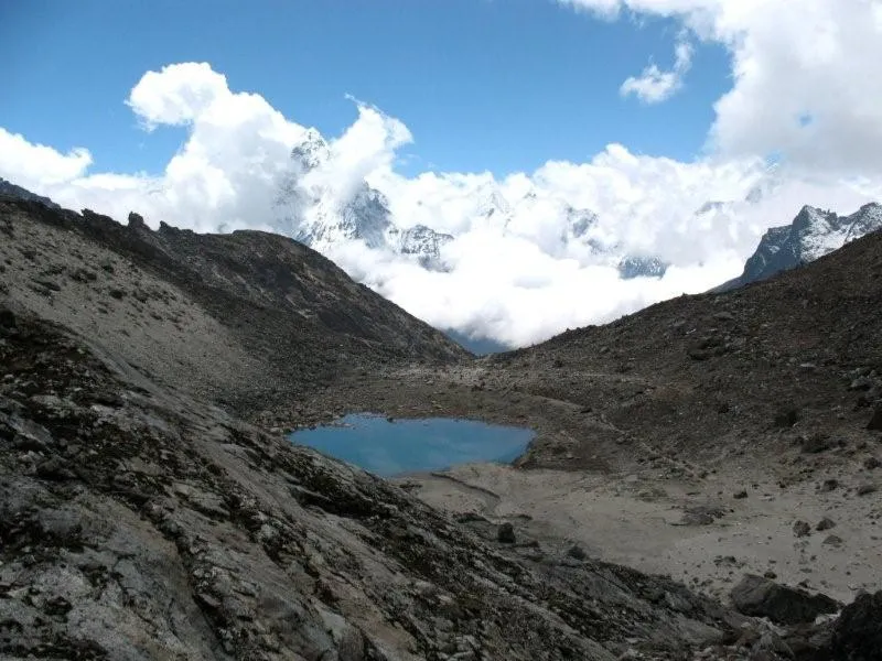Lagomt tills det att vi gav upp och packade ihop vårt läger så skingrades molnen lite grann. Foto taget över Lobuche High Camp. Vårt läger var placerat ca 100 höjdmeter högre upp. I 4 dygn satt vi i ett tält och väntade på att det skulle sluta snöa och regna men icke... Vi fick ge upp. Nytt försök en annan gång :)