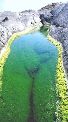 Tack för kommentarer. Det gröna är grönslick, en grönalg som ofta växer i hällkar i Östersjön.