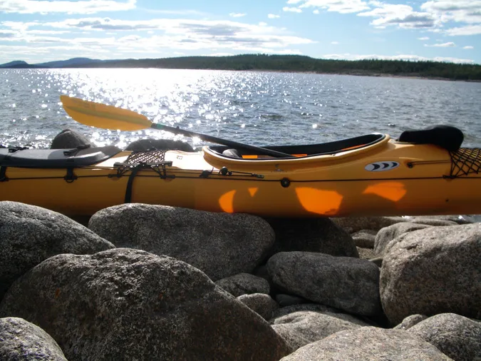 Kajak på stranden till Grisselskäret utanför Rotsidan i Höga Kusten