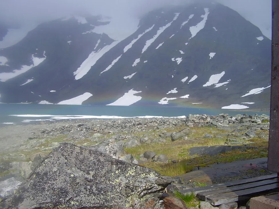 Denna bild får symbolisera vädrets växlingar, det snöar på kaskasapakte+tjåkka, regnbåge syns över sjön och solen gassar framme vid stugan :-)