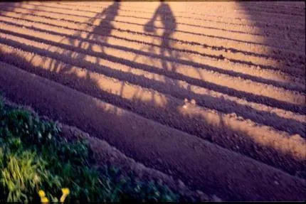 Sen kväll, långa skuggor, ljumma vindar och nyplöjda åkrar.