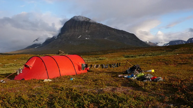 Skönt perspektiv och härliga kontraster med det röda tältet i förgrunden och hela Nijaks mörka profil i bakgrunden.