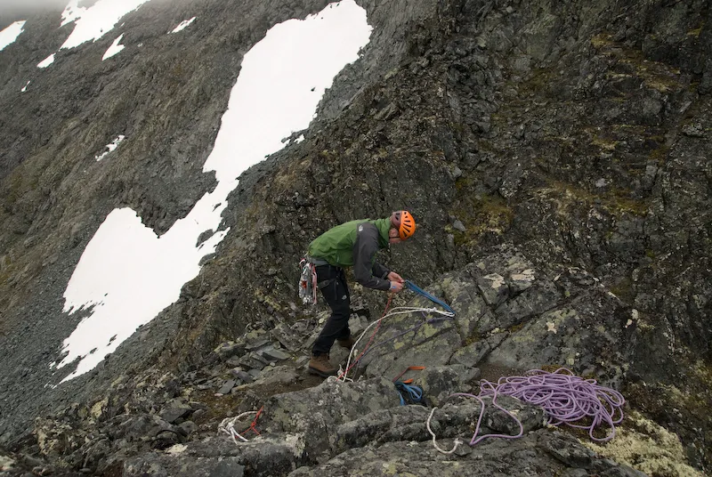 Ordnar ett firningsankare från första Tempelpinnackeln. Vilket visade sig inte vara det lättaste om man inte hade någon riktigt lång slinga. Tur att man hade 5 meter repsnöre i ryggsäcken, dock i tunnaste laget. Denna lades runt stenen där alla andra hade lagt sina rep runt. Och sedan en 120 slinga genom bulten. Backade upp med några av de gamla repet som såg bäst ut, resonerade att de är bättre än ingenting i alla fall.