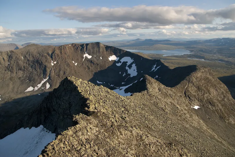 Kammen upp till Storsylen på Syltraversen, Djävulskammen längst ner till vänster i bild, alldeles ovanför snöfältet. Taget från Storsylen. Storsola i bakgrunden.