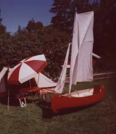 Kanoten är usprungligen gjord för att vara seglingsbar, men säljaren hade aldrig köpt utrustningen, så jag byggde en själv. Aluminiumrör på längdvara och dacronsegel från en tidigare ägd Stjärnbåt som kortats ner. Toppen av seglet används som försegel, storsegelet hålls ut av ett spristag i aluminium. Jag har nu flyttat seglet mer till mitten, byggt utanpåliggande centerbord, och bygger just nu pontoner, utriggare.