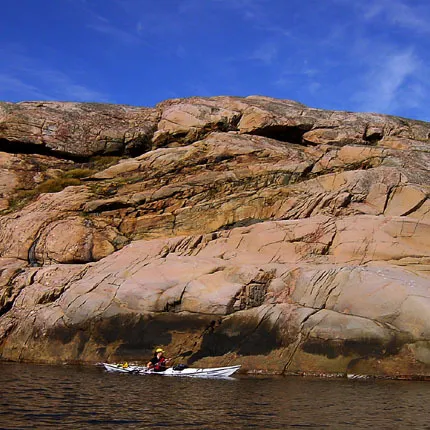 Den lilla kajaken är en bra kontrast mot det stora massiva berget. Mycket vacker färg i klippan.