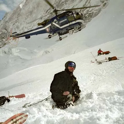 Helikoptern kommer för att hämta Fredrik som fallit ned i en glaciärspricka och skadat sig. Han blev senare hemskickad till Sverige.