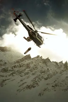 Helikoptern lyfter direkt trots att Fredrik och båren inte är indragen.