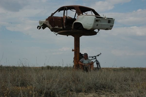 När det är varmt kan det vara skönt att söka skugga under en bil. I södvästra Kazakstan är det vanligt med gamla bilar som är uppsatta längs vägarna. Ett perfekt ställe för skugga.