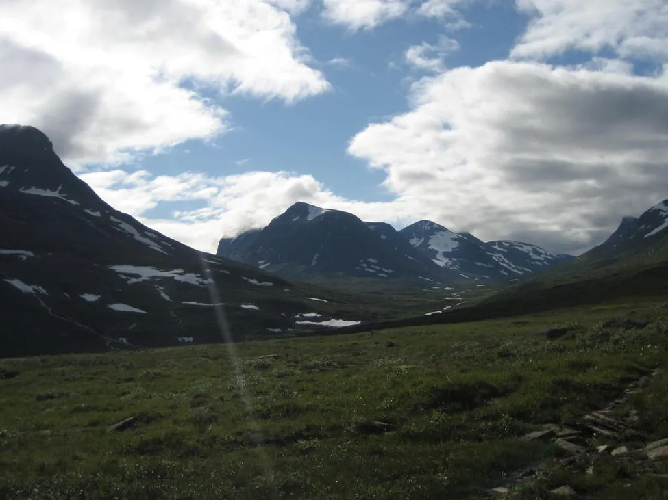 Jag har precis lämnat Mikkastugen och påbörjat min vandring österut. Detta är en återblick mot guohpervagge och alggavagge. Efter att ha vandrat genom guohpervagge under låga moln var detta förstå gånge jag fick se dess toppar ordentligt.