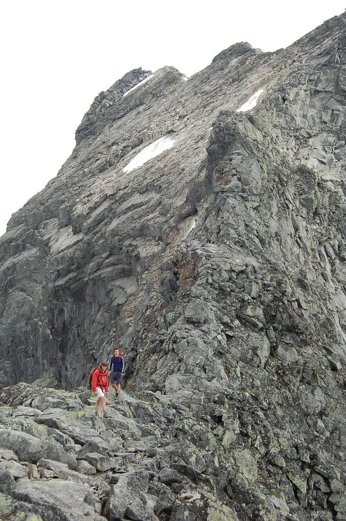 Ibland är shorts allt man behöver! Far och Bror på väg upp på Stora Austabotn tind i Hurrungane. Brantare topp får man leta efter! Exponerad klättring hela vägen men lätt. Fantastisk utsikt från toppen över hela Hurrungane massivet.