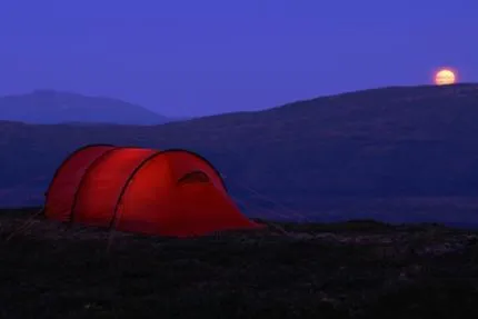 En bild på mitt Hilleberg tält med Åreskutan och månen i bakgrunden.