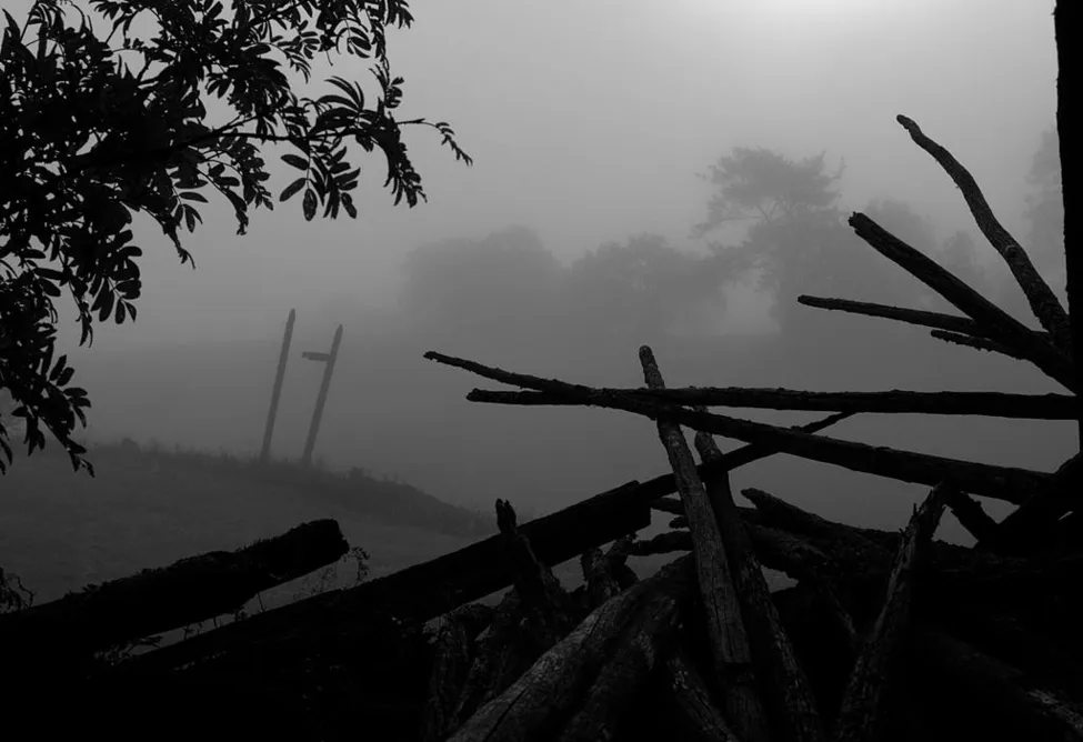 Härlig balans av svärta och gråskala. Perfekt balans och harmoni men ändå lite farlig och dramatisk. Kontraster mellan mjuka linjer och stickande pinnar/stockar.
