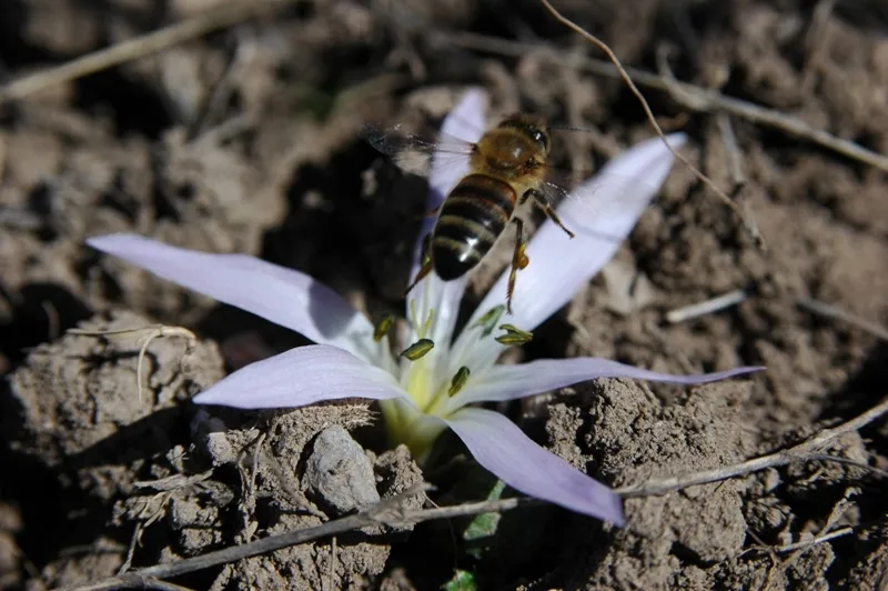 Ett tidigt bi som samlar pollen på vårens första blommor i Armenien. Blomman är en tidlösa/Colchicum