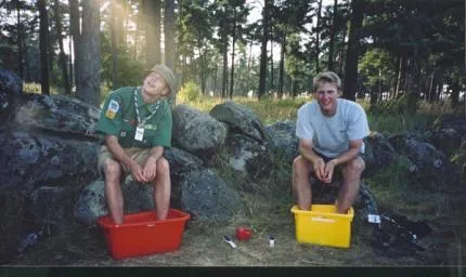 Här sitter jag och en kompis och tar ett välförkänt fotbad efter at har jobbat hela dagen som funktionär på lägret "scout2001". Det var fint