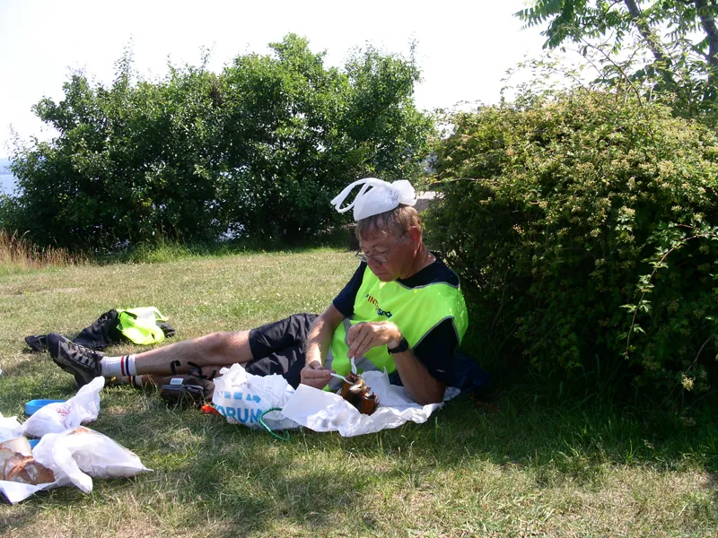 Den här bilden är tagen under min långfärdscykling från Skåne till Lappland. Det var mycket hett, närmare 30 grader i skuggan, och min reskamrat var tvungen att lägga en plastpåse fylld med is på sitt huvud.