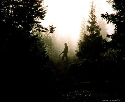 Jakt kamraten smyger med tysta steg genom dimman.