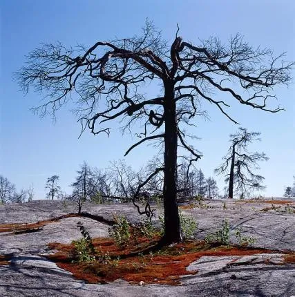 Tyresta Nationalpark, strax söder om Stockholm. Ett ofta besökt område. Kolsvarta tallar och blommande röd mossa skapar ett nästan surrealistiskt