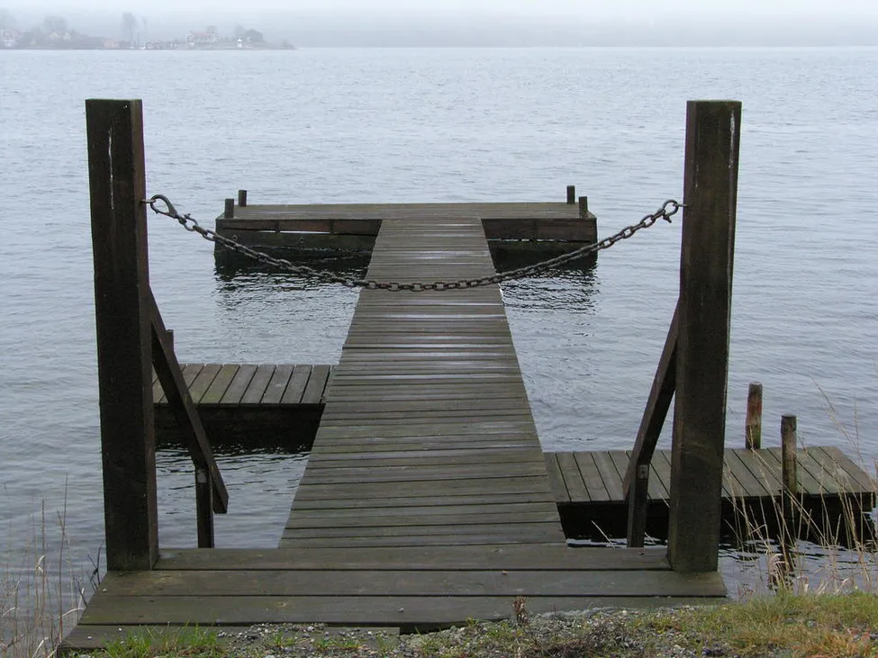 Dalarö i vila efter sommaren. Dimman sänker sig över fjärden. Kedjan stoppar vårt bryggbesök.