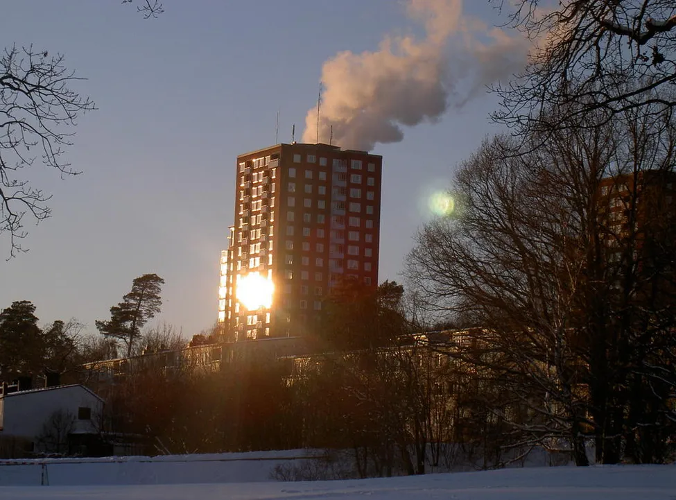 Så illa att nån flyger in i Hässelbyhusen är det nu inte. Men mycket rök är det som kommer från Hässelby värmeverk, vars skorsten liggar en bit bakom huset. Å "explosionen" är givet en solreflex i fönstren