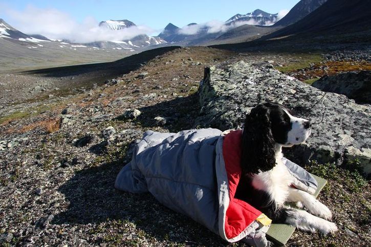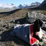 Goman värmer sig i morgonsolen. Skönt att ha en egen sovsäck ibland, tycker världens mest frusna hund.