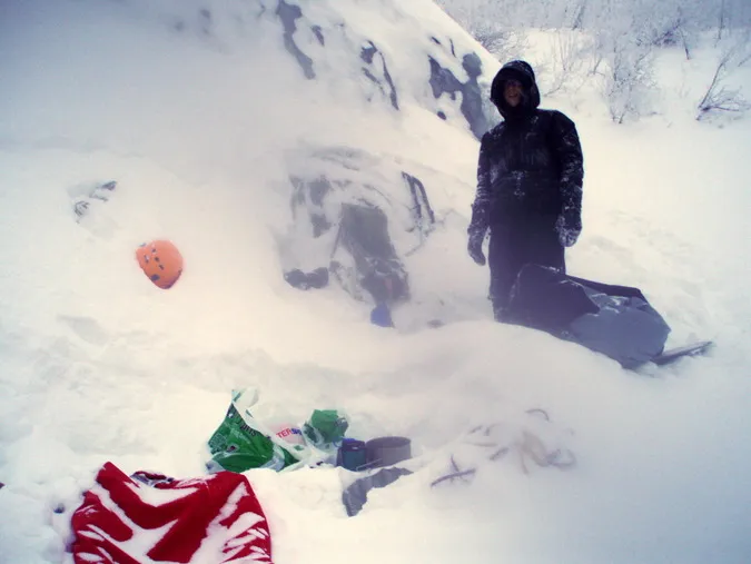 Brad Schofield tar en bild på vår bivack dag två på Gausta Marathon. Snöandet höll oss vakna hela natten. Vi höll på att bli avsnöade från vår hylla. Jag var tvungen att skyffla bort en halvmeter snö som ansamlats bakom ryggen på mig två gånger under natten. En mycket minnesvärd och karaktärsbyggande upplevelse :)