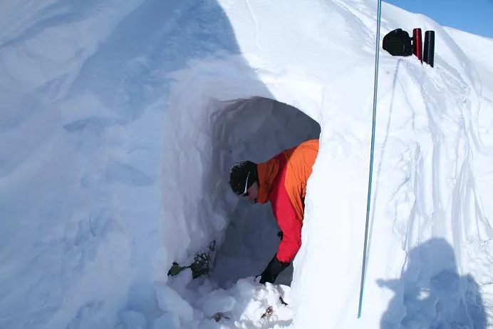 När man arbetat sig in i drivan kan man nyttja liggunderlaget till att transportera ut snön med (läs kälke).