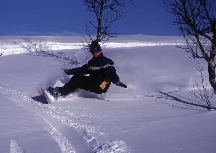 Erik trycker ett hälskär i go puder back i Laxfjället en eftermiddag.