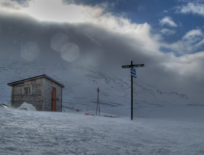 Jag har vindskyddet strax bakom mig när jag tar bilden. Den lilla hyddan på bilden är nån typ av förråd, sopor och lite sånt.