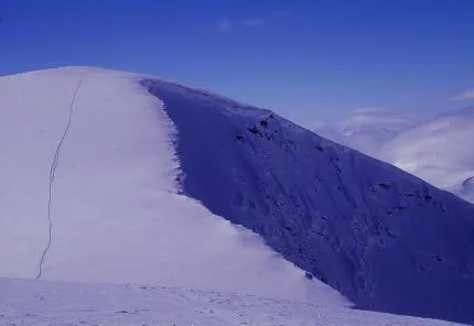 En titt bakåt på våra spår. Stighudarna satt kvar när vi gled ner för denna slutning. Jag står på slutningen upp mot Sytertoppen och blickar väst.