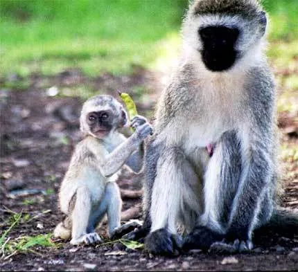 En liten apunge leker med en böna.