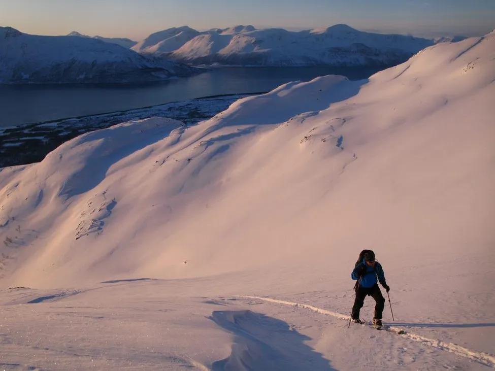 Anders i kvlällsolen ett stycke upp på sofiatinden. Fin fin køring ner i solnedgången.