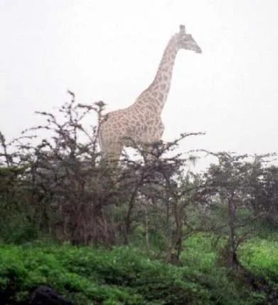 En giraff uppenbarar sig i dimman uppe i västra väggens bergsmassiv i Tanzania.