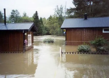 Ån har tagit flera nya vägar. Här har vattnet dock dragit sig tillbaka ca. 40cm, maxnivån syns på husväggarna.