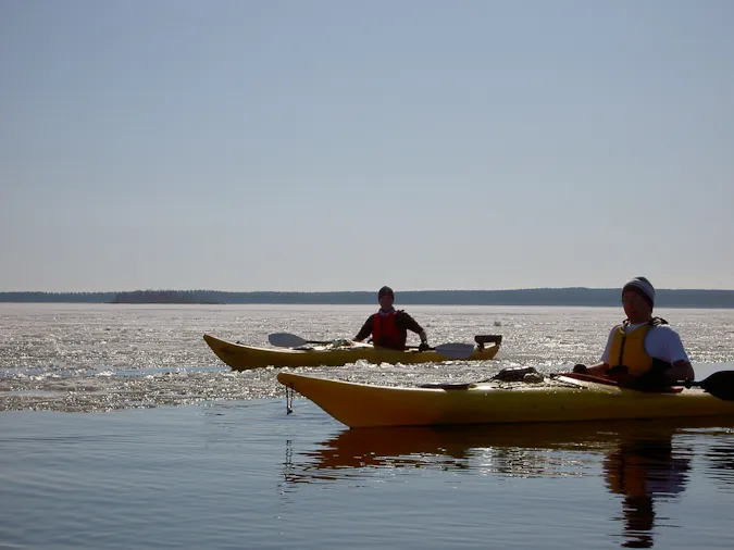 Janne i förgrunden har precis tagit sig igenom ca 200 meter slushpuppy-is och snö. Jag sitter för tillfället fast mot ett tjockare isblock och måste backa lite och ta sats på nytt. Det gick bra att jag som hade tyngsta packningen agerade brytare åt de andra så de kunde köra i min ränna men på sista biten valde de en bättre väg än mig och min sambo kunde komma ut först och ta en bild på mig när jag satt fast =)