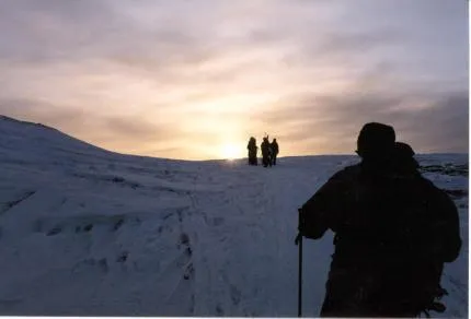 På väg upp till att se den sista solnedgången på 4 månader. Tyvärr kom molnen in över fjället så någon solnedgång blev det inte, men det var fint på vägen upp.