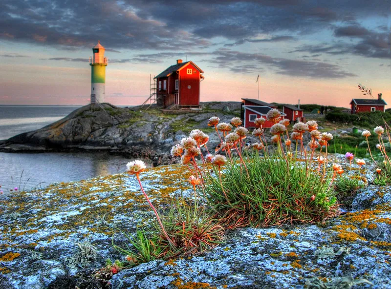 Vackert! Speciellt gillar jag hur det flacka ljuset "delar" stugan och fyren! Var är bilden tagen?