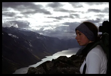 Tone tittar ut över Gende på vandring över Besseggen, Norge