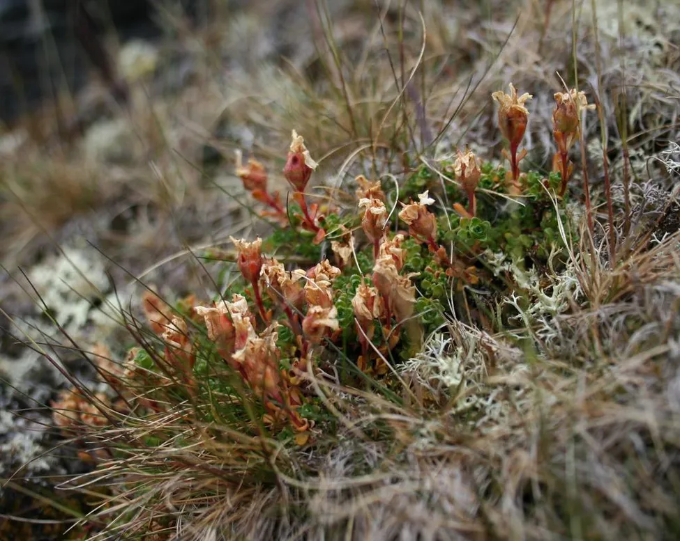 Svårt att se bladen ordentligt, men skulle kunna vara överblommad stormsippa/fjällgröna. Omgivningen ser dock för frodig ut.
