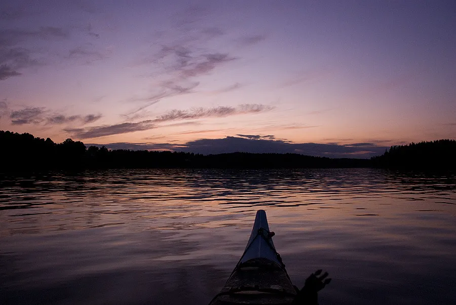 Underbart att bara kunna ge sig ut en sväng på kvällen och njuta av färgspelet på himlen o i vattnet, tystnad och kajaken som glider fram :)