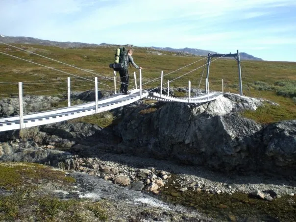 Bro över Caihnajohka på leden mellan Caihnavaggehytta och Cunojavrrehytta. Roligt med "dubbelbro"! Inte så ranglig som den ser ut.