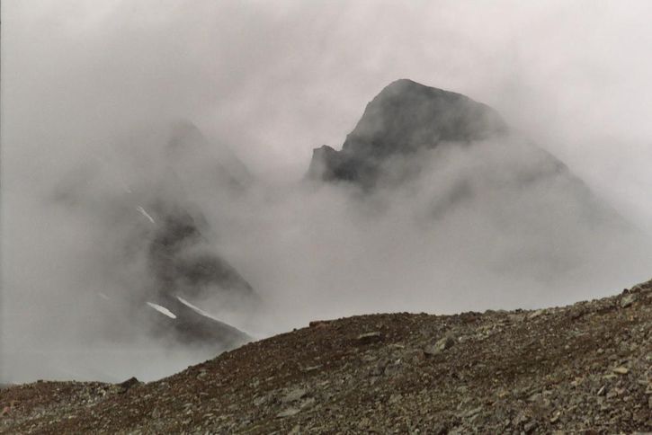 Saitaris sticker upp genom molnen. Vy från Pårtetjåkkås sluttning