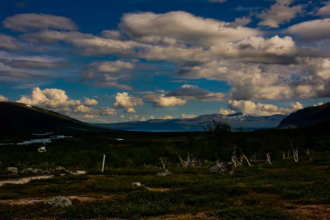 Padjelantaleden i riktning norrut. Till vänster Gasskatjåhkkå och Vuojatädno. Till höger skymtar Áhkká
