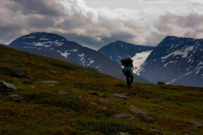Vandrare på Låvdakvárddo. I bakgrunden skymtar Guohper till vänster. Till höger Lánjektjåhkkå med vattendelarglaciären. Därimellan Guohpervagge.