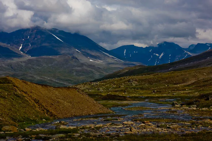 Sarekmassivet från Guohpervágge. I förgrunden Guohperjåhkå.