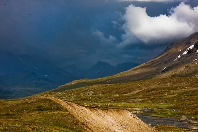 Sarekmassivet från Guohpervágge. I förgrunden Guohperjåhkå.