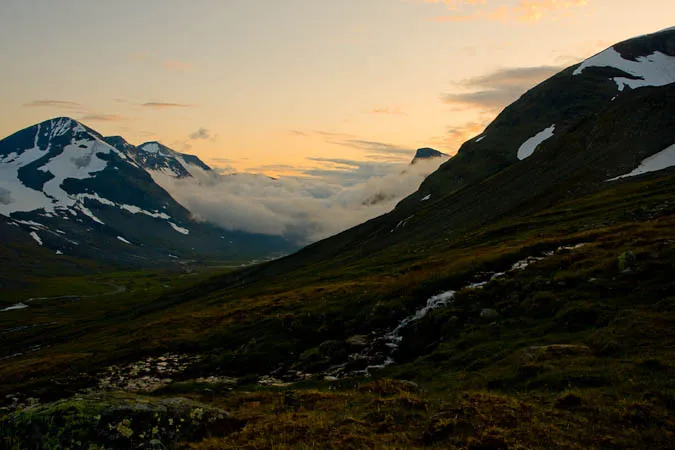 Mycket vacker bild som innehåller många av mina favoritmotiv så som fjäll, dimma, vatten samt kvällsljuset.