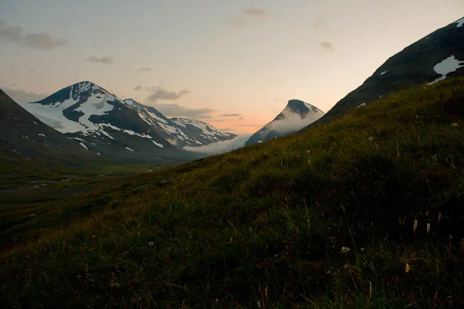 Från Skárjátjåhkkås sydsluttning. I bakgrunden Sjielmatjåkkå och Lánjektjåhkkå. Guohper knappt synligt bakom molnen