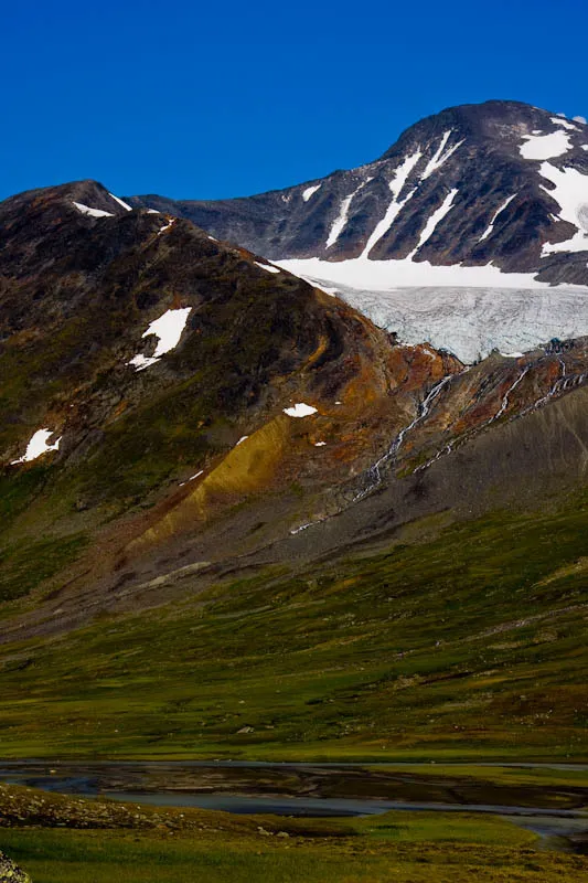 Gássatjåhkkå och Gávabákte. I förgrunden Smájllájåhkå